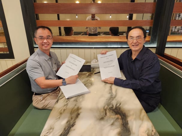 The CEO of Hualang Energy Dato Joshua exchanging the MOA with Mr Aviers the CEO of H2G Energy Ltd subsidiary on a collaboration to build a Hydrogen plant in Malaysia